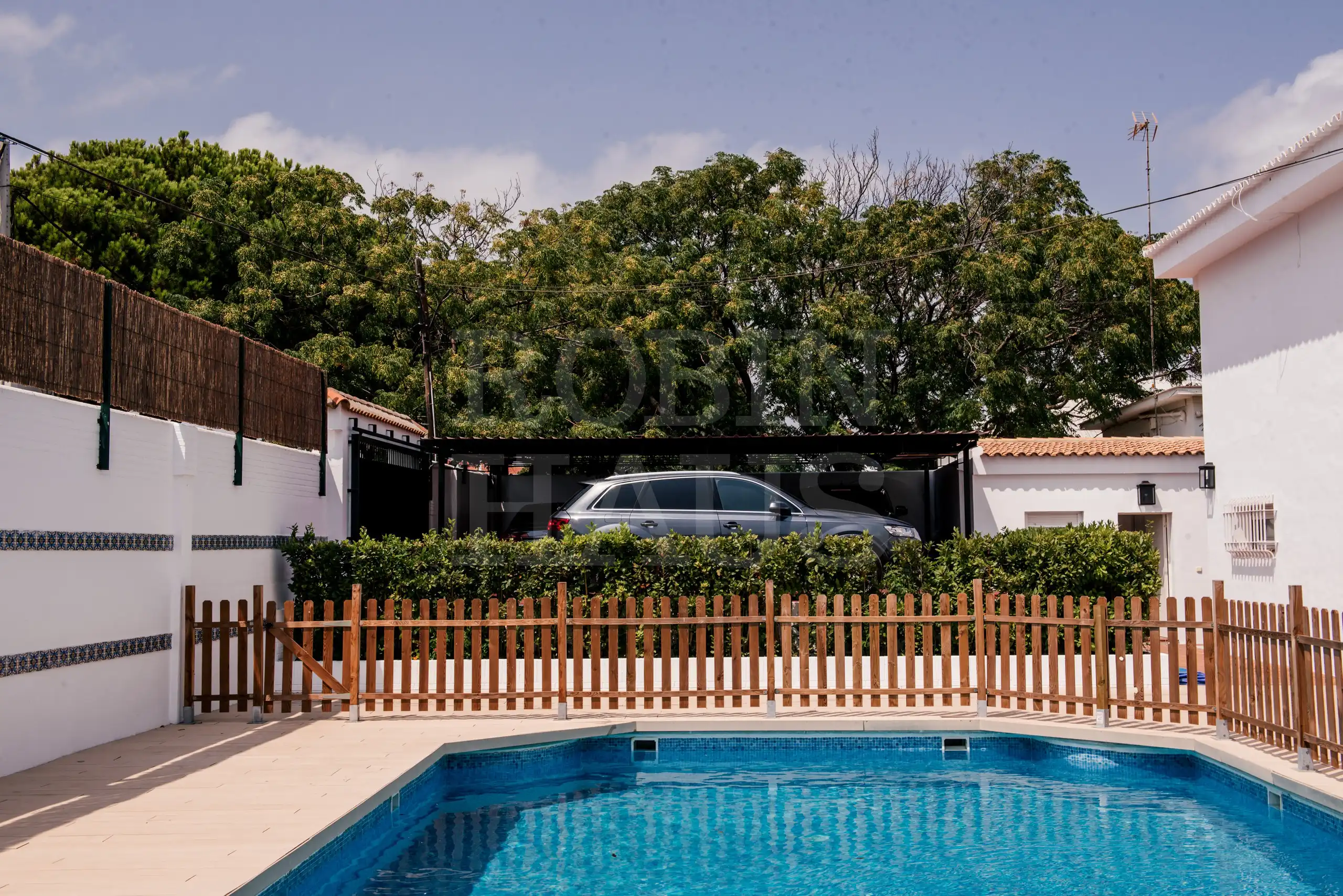 Chalet en la ría de Punta Umbría, de 500 m² construidos, perfecto estado, en parcela de 1.100 m² con jardín y arboleda, a pié de playa, amplia zona de aparcamiento como para 4 coches, agua caliente independiente, aire acondicionado de frío/calor en una habitación, orientación sur, dos plantas, fachada de ladrillo, perfectamente amueblado y decorado, piscina muy amplia de agua salada con cómoda zona de solárium, amplio porche en planta baja con zona de juegos y de relax. Gran terraza en 1ª planta con vistas a la ría de Punta Umbría y puerto deportivo. Dos de las habitaciones (con 2 camas de 90 cm cada una) son para el personal del servicio, con baño en cada habitación, se encuentran fuera de la vivienda principal, en planta baja.